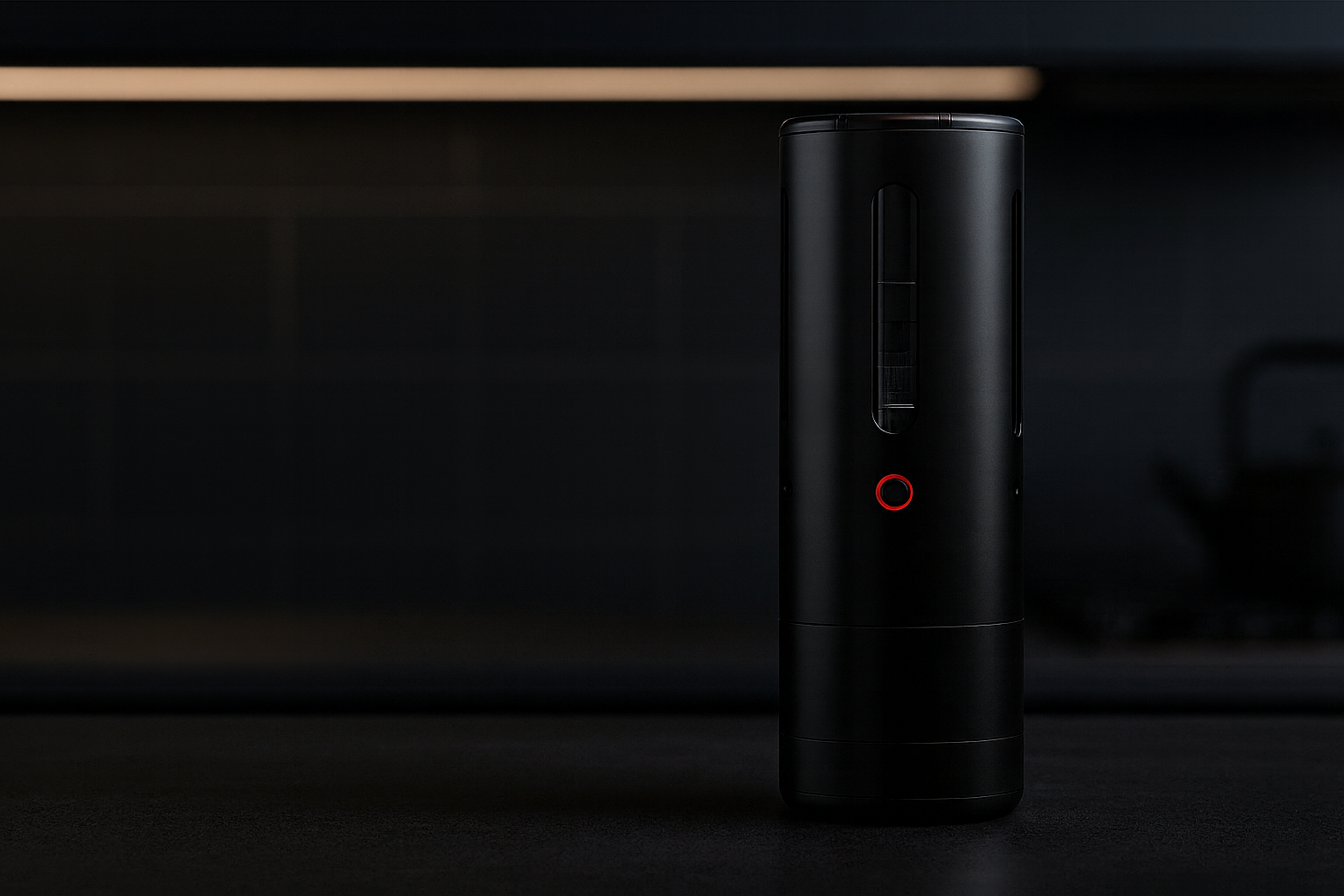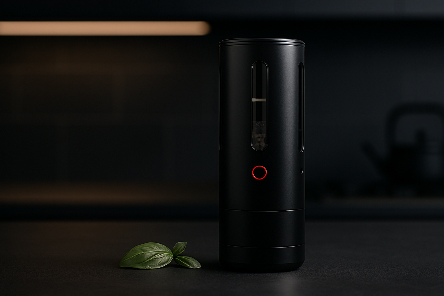 Das modulare 3-in-1 Gewürzsystem für moderne Küchen: Mahlen, Lagern und Dosieren vereint in einem futuristischen, minimalistischen Design.